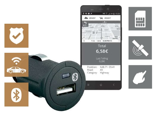 Compact Tolling Dongle Toll Devices. Security, functionality and mobile connectivity. Identification of routes and payments takes place in the cloud. Through an internet connection and GPS, the user can access a comfortable interface through an app on their smartphone to view the routes traveled and their corresponding costs.