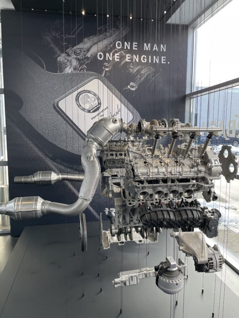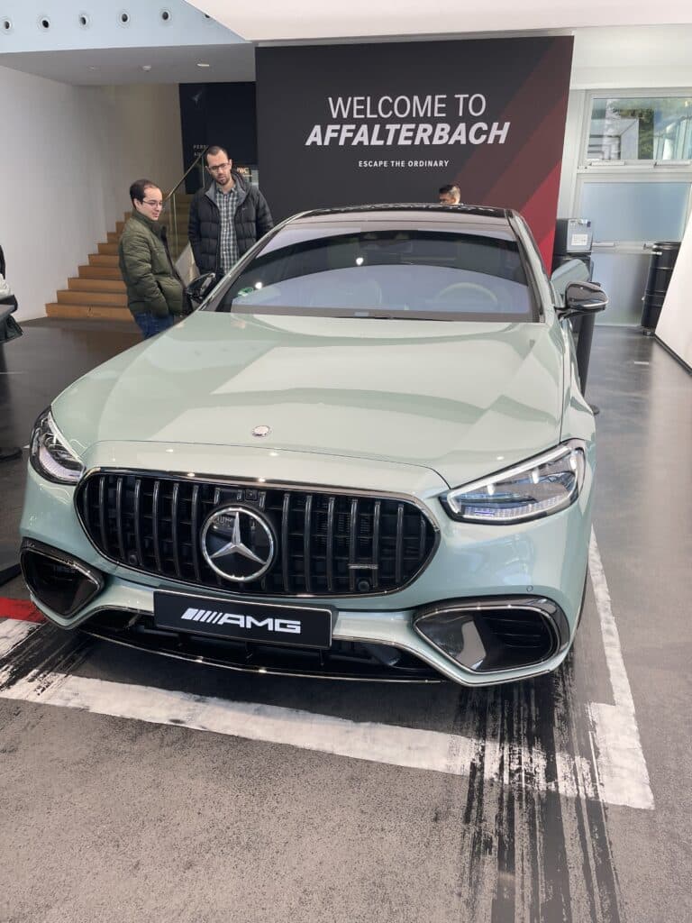The tour began in the showroom of the AMG site, where the company’s history was explained to us, from its beginnings through key milestones to its current position as a high-performance brand. In the entrance area, an engine on display was particularly eye-catching, exemplifying AMG’s technical performance and expertise. The exhibition is complemented by trophies, engines, vehicle parts and a changing selection of special vehicles, including older models and versions no longer in production. Overall, the room provides a vivid overview of the development and diversity of Mercedes-AMG.